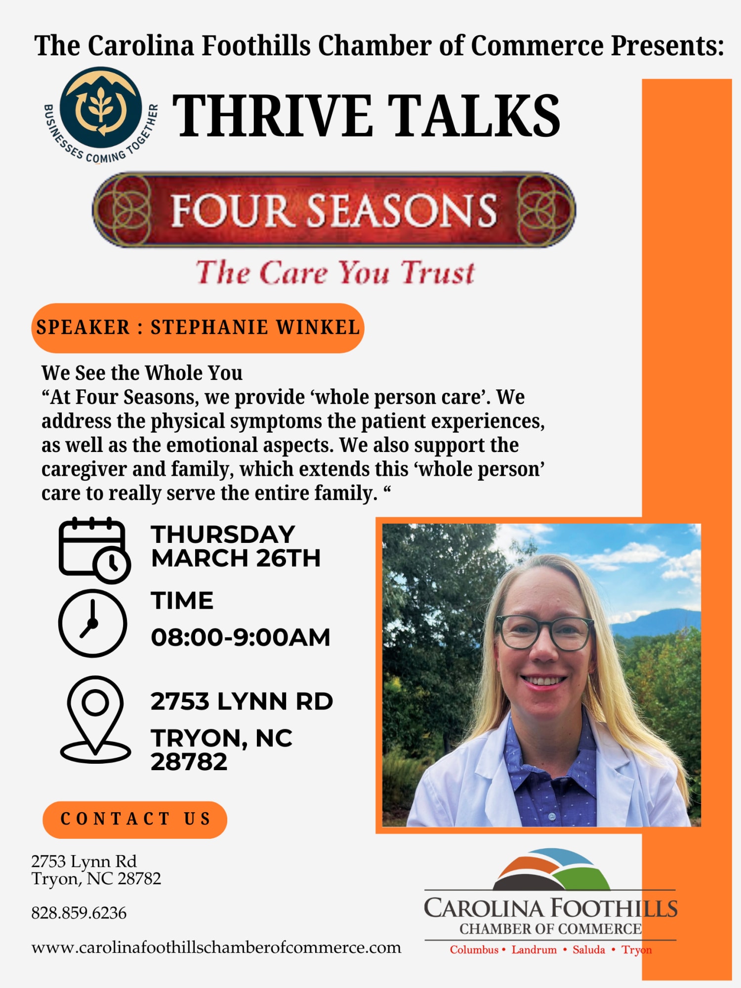 Join us for a discussion with Stephanie Winkel: We See the Whole You "At Four Seasons, we provide ‘whole person care’. We address the physical symptoms the patient experiences, as well as the emotional aspects. We also support the caregiver and family, which extends this ‘whole person’ care to really serve the entire family. "