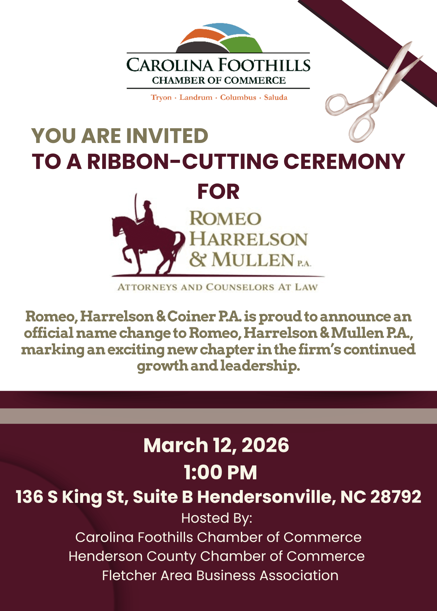 Join Carolina Foothills Chamber of Commerce for the celebration and ribbon cutting ceremony for Romeo, Harrelson & Mullen P.A.