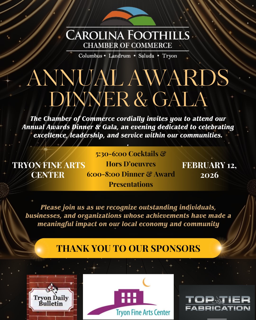 Come celebrate with dinner, beer/wine and camaraderie! Join us at Tryon Fine Arts Center as we honor some special people for their outstanding contributions to the Chamber and the Foothills communities in 2025. Images