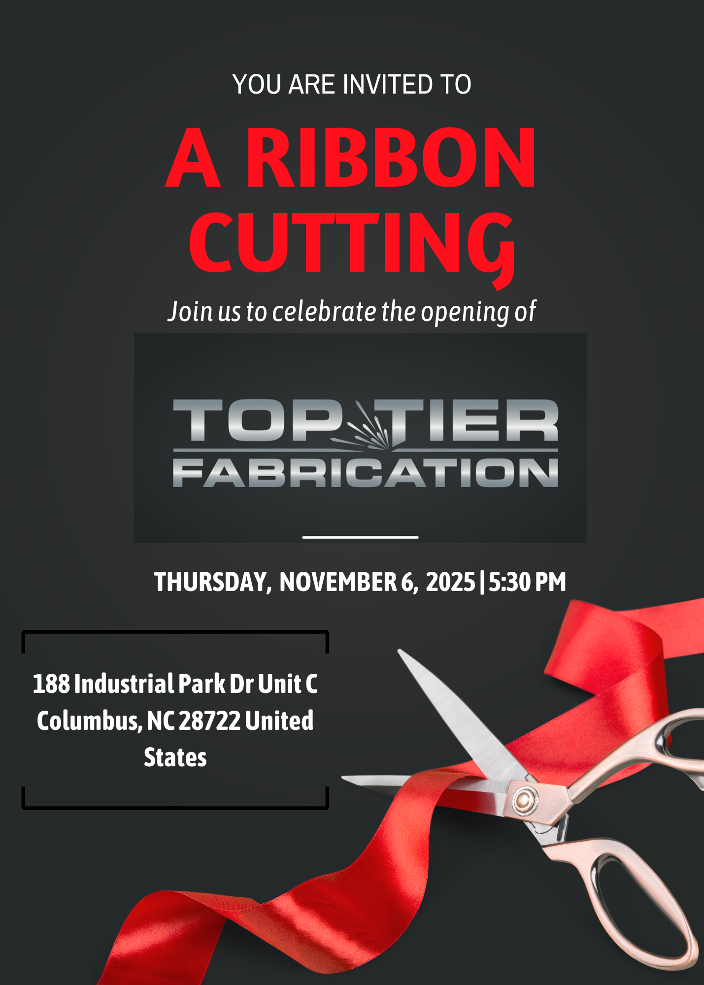 Join the Carolina Foothills Chamber of Commerce for a ribbon cutting ceremony for Top Tier Fabrication at 5:30 PM. Please join us in supporting our neighbors. Address: 188 Industrial Park Dr Unit C Columbus NC 28722
